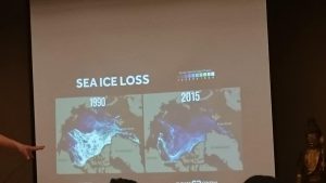 ・今のままでいくと、北極の氷はゼロになる。古い氷がどんどんなくなっている。(氷の)島が減ってきて、ホッキョクグマがえさを探すために泳ぐ距離が長くなっている。親は耐えれれるが、子熊は長い距離を泳ぐ体力がなく、おぼれていく。