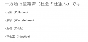 一方通行型経済(取って、作って、売って、買って、使って、捨てる)この流れの背景には何が起こっているのか?例えば、